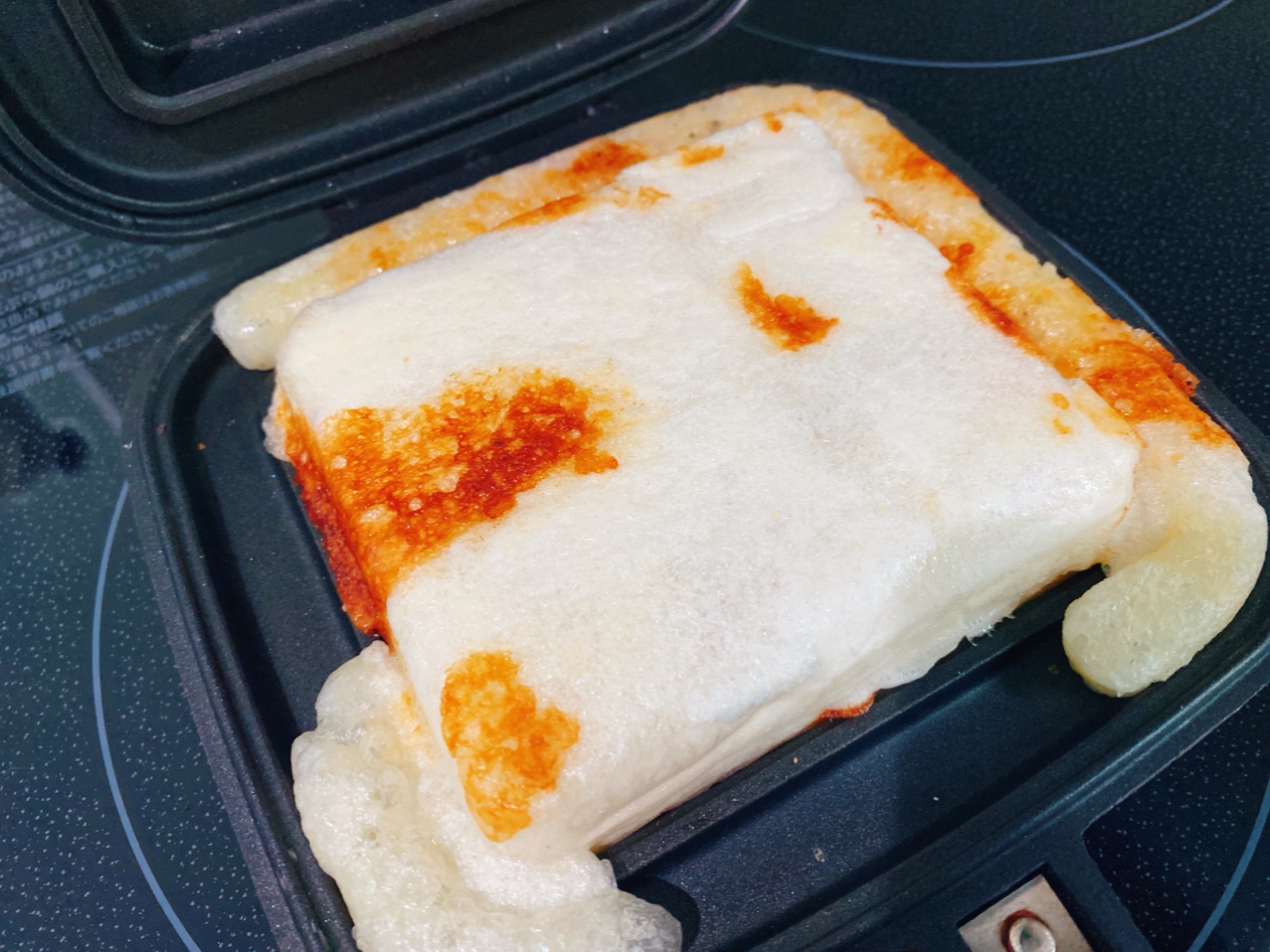 お望月さん これがホットサンドメーカーで 餅 とベーコンチーズを挟んで焼成したものです 膨張する特性を持つ餅を挟み込んで圧縮して具現化させる つまりオーバーソウルです これがうまい